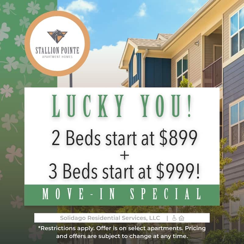 You’ll love our affordable Everman apartments for rent. Stallion Pointe Apartments feature one-, two-, and three-bedroom floor plans to choose from with unsurpassed amenities. Each apartment comes complete with modern kitchens with self-cleaning ovens, garbage disposals and a dishwasher for added convenience, 2-inch plantation blinds, ceiling fans with light fixtures, private patios, and much more! Our community boasts a brand-new resident clubhouse next to our outdoor swimming pool, a game room, a technology room, and more!